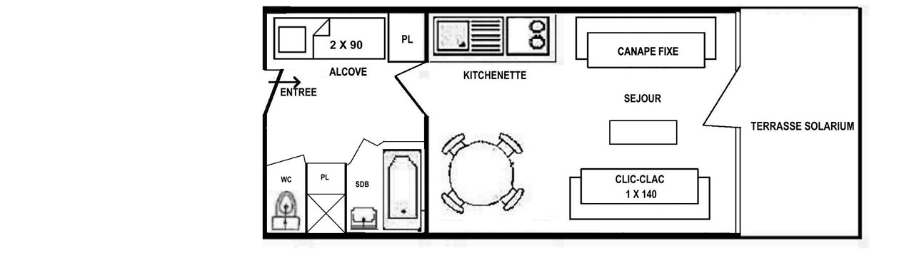The apartment has a living room with a 140cm sofa bed, an open-plan fully-equipped kitchenette, an alcove with 2x90cm bunk beds (NB: the top bunk bed is not suitable for children under 6), a bathroom and separate WC.