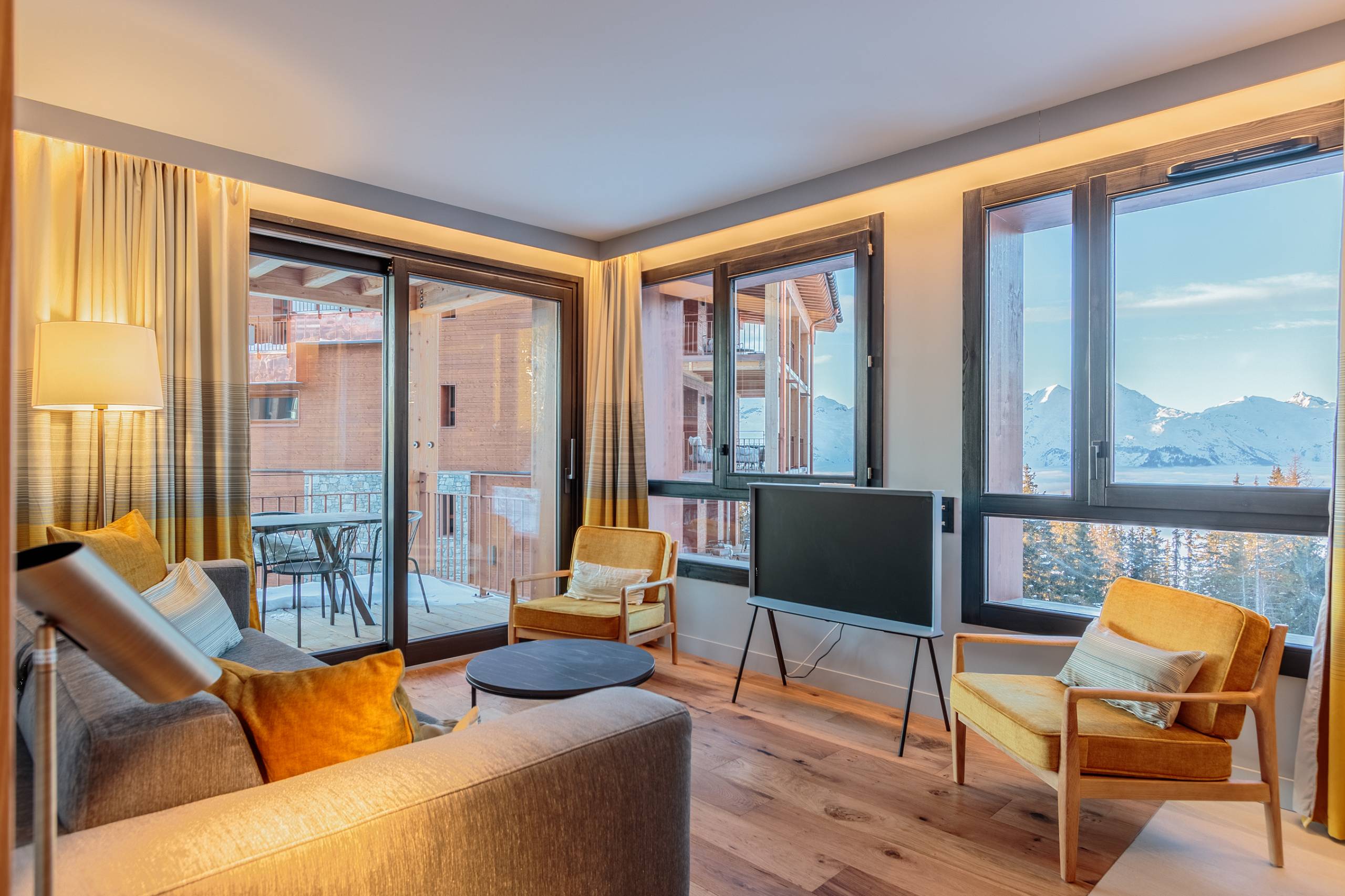 Appartement NEUF 6 personnes, 64 m² avec 2 chambres + 1 coin montagne et 1 grande TERRASSE orientée Ouest avec une magnifique VUE PANORAMIQUE sur le Mont Blanc. Décoration chic et contemporaine !