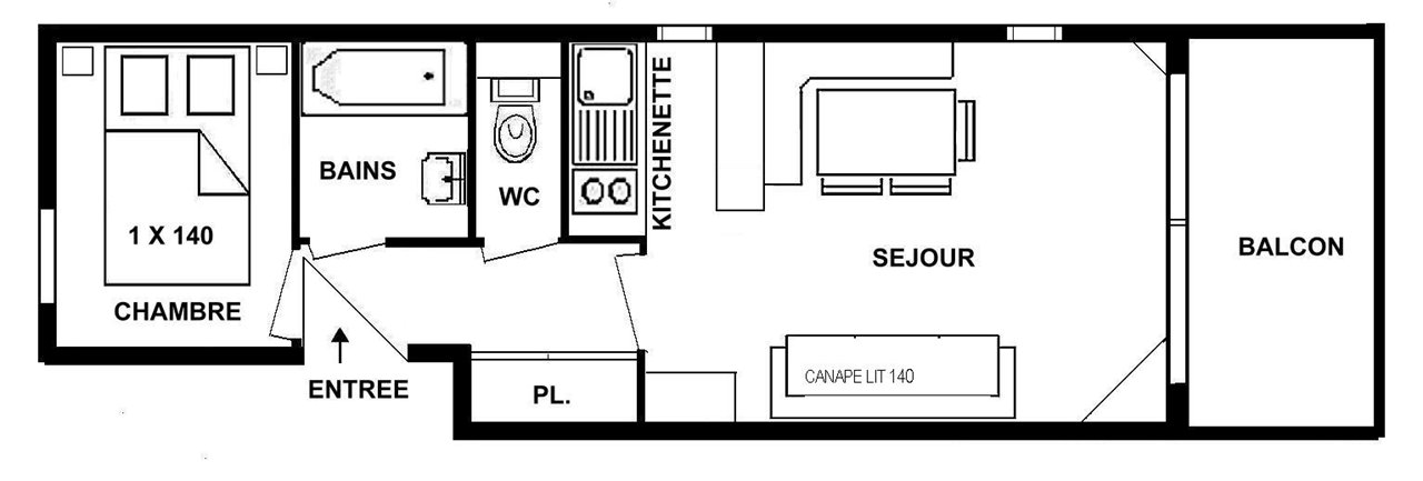 L’appartement se compose d'un séjour avec un canapé RAPIDO 140 et d'une kitchenette équipée ouverte, d'une chambre avec un lit 140, d'une salle de bains et WC séparé.