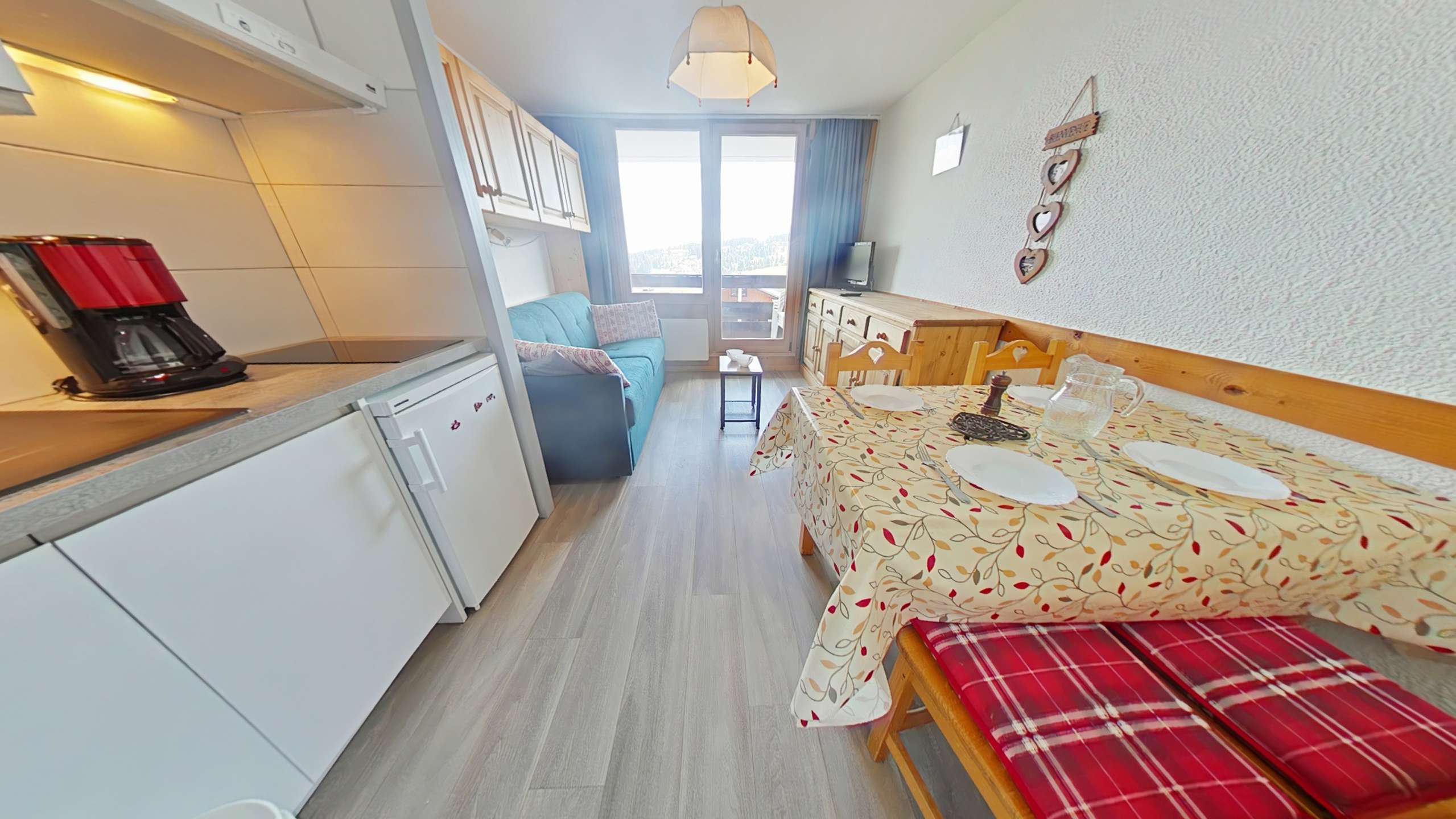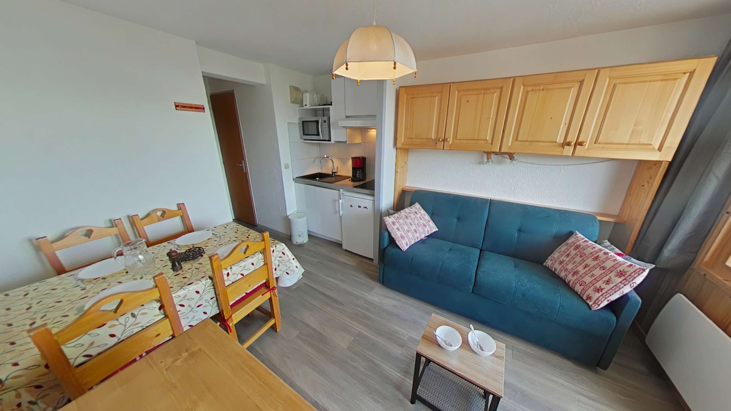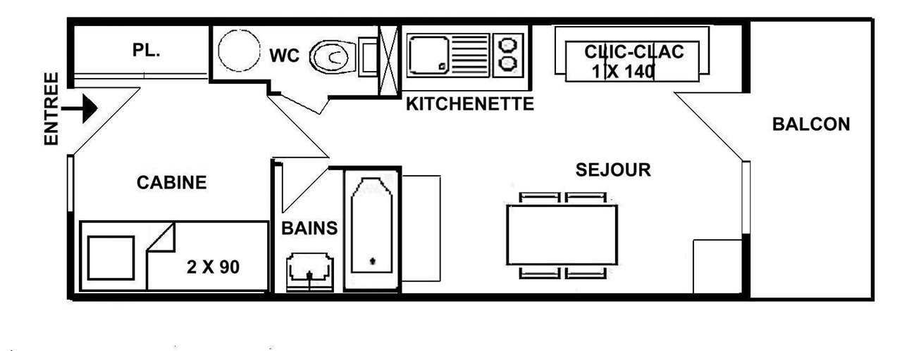 L'appartement comprend une kitchenette équipée, un séjour avec un canapé RAPIDO 140, une cabine avec lits superposés 2x90, une salle de bains et un WC séparé.