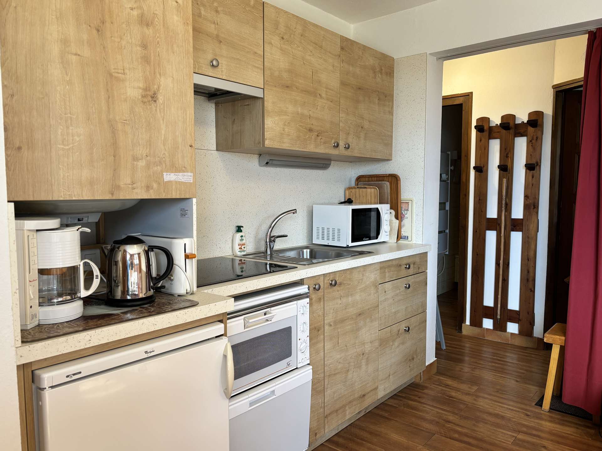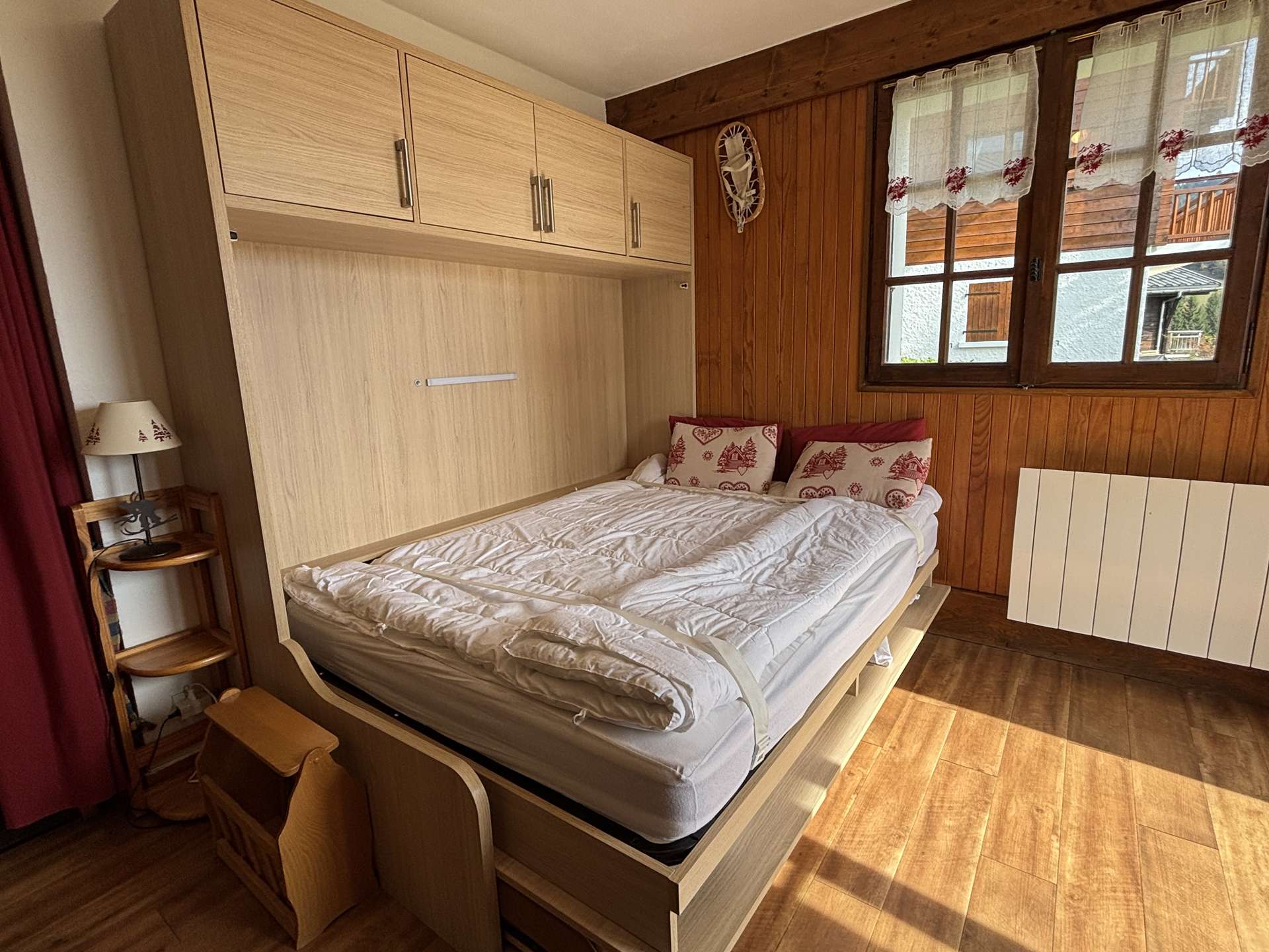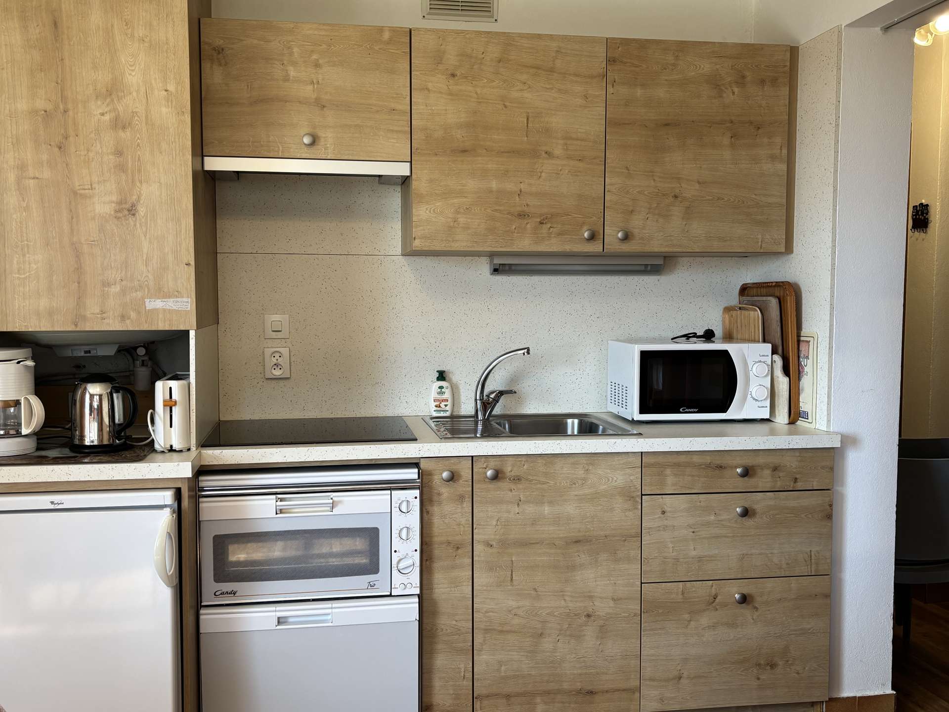 L'appartement se compose d'un séjour avec un lit escamotable 140 avec canapé, d' une kitchenette équipée donnant sur une terrasse, d'une chambre pouvant être utilisée avec soit la banquette avec lit tiroir (2 x 80) soit avec le lit escamotable en 140, d'une salle de bains et d'un WC séparé.