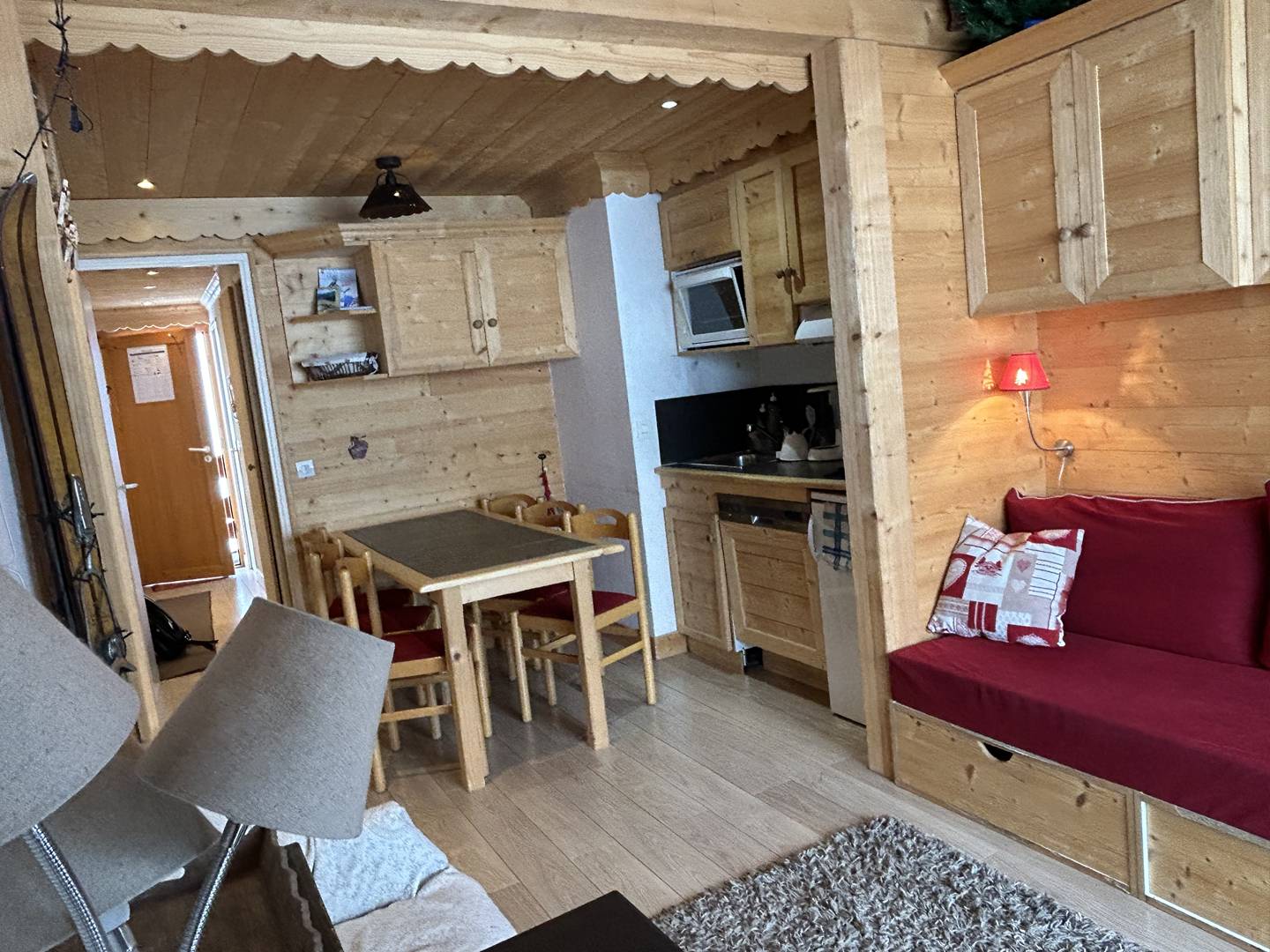 Appartement en duplex : Au rez de chaussée, vous trouverez une chambre cabine avec 2 lits superposés (2x80 cm - avec fenêtre sur coursive). Un séjour agréable avec balcon, la cuisine ouverte équipée de plaques électriques, four, lave vaisselle, bouilloire, réfrigérateur, grille -pain, cafetière. Une salle de douche rénovée avec wc.