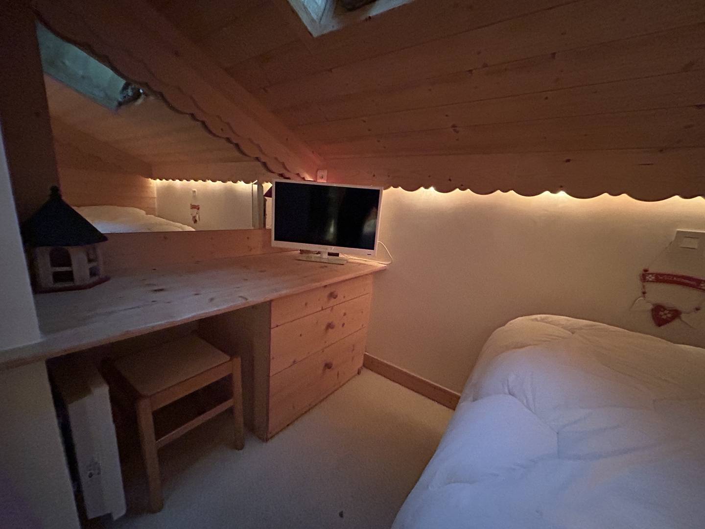 Niveau + 1: une chambre mezzanine (non fermée et sans fenêtre) très mansardée (hauteur mini 80cm au pied du lit). Une chambre mansardée avec un lit double (140x190) et velux. Une salle de bain avec baignoire (pas de wc). Casier à skis et ascenseur dans la résidence.